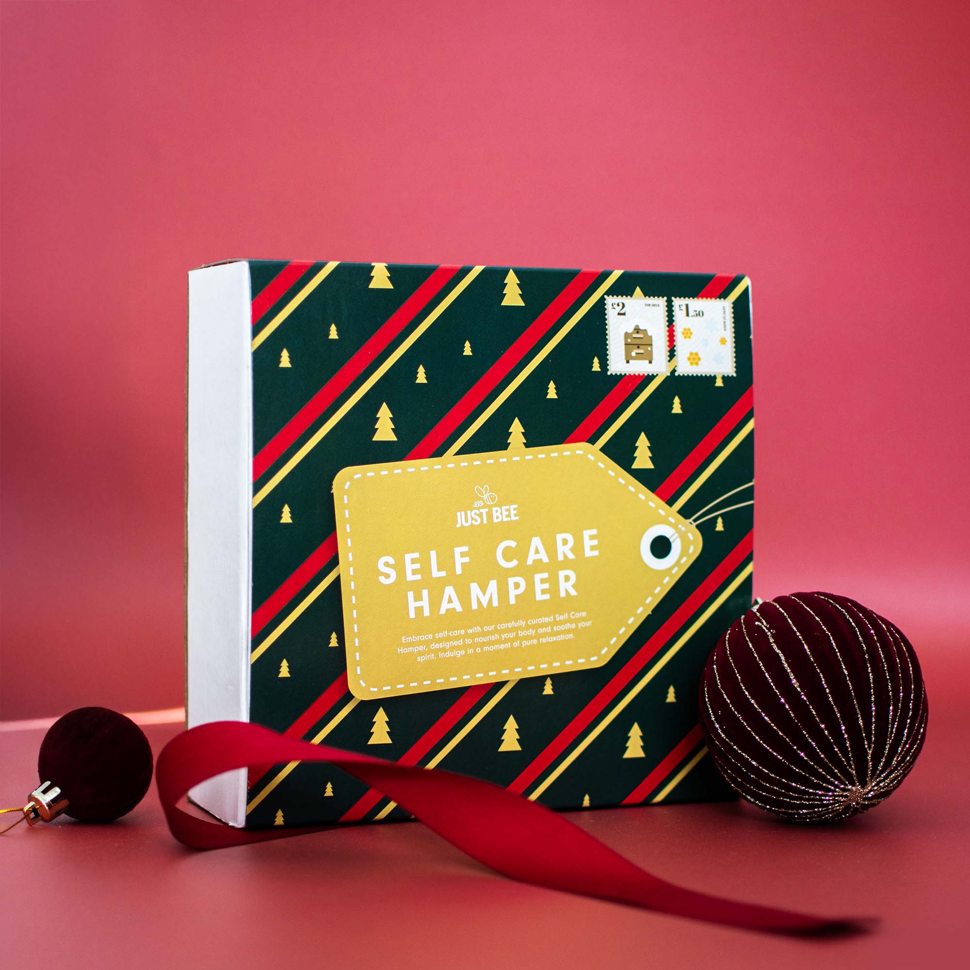 All our hampers are carefully prepared and beautifully packed by hand. For this "Self Care" Hamper we use a classic white box with recyclable cream packing paper and a luxurious Christmas themed Sleeve.